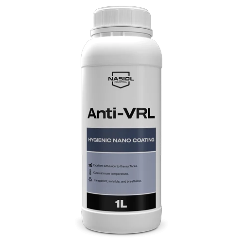 Nasiol Anti-VRL je dugotrajni nano-premaz s antimikrobnim i antivirusnim svojstvima, formiranom silan-tehnologijom koja stvara čvrstu povezanost s površinom. Prikladan za tekstil, kožu, staklo, metal, keramiku, plastiku i obojane površine. Nevidljiv, prozračan sloj pruža zaštitu od virusa, bakterija, plijesni i algi — eliminira potrebu za čestim dezinfekcijama i održava prirodni izgled površine.